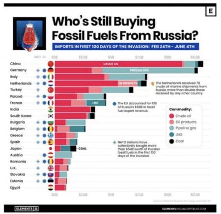 Cũng cần lưu ý rằng một số quốc gia châu Âu, bao gồm một số nhà nhập khẩu lớn nhất trong thời gian 100 ngày, đã cắt giảm nhiên liệu hóa thạch của Nga. Bên cạnh quyết định chung của EU nhằm giảm sự phụ thuộc vào Nga, một số quốc gia cũng đã từ chối kế hoạch thanh toán bằng đồng ruble, dẫn đến việc giảm nhập khẩu.
