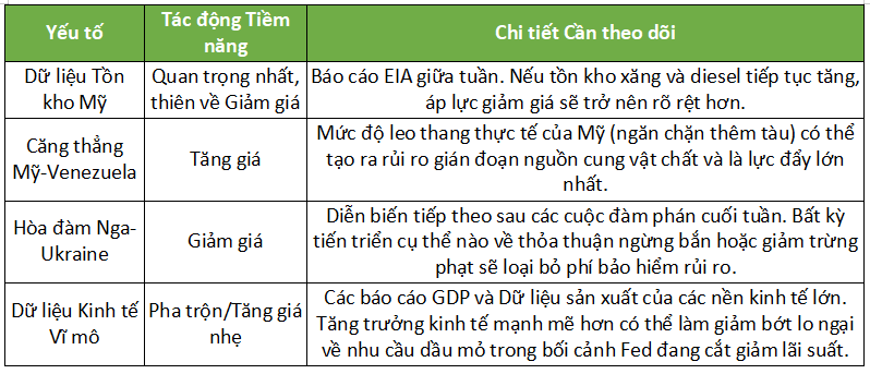 Hòa đàm và Rủi ro Địa chính trị bị Phớt lờ: Mặc dù Mỹ có hành động bắt giữ tàu chở dầu Venezuela và có tin tức về các cuộc tấn công của Ukraine vào giàn khoan/nhà máy lọc dầu Nga, thị trường đã bỏ qua những rủi ro địa chính trị này. Thay vào đó, triển vọng hòa đàm Ukraine làm giảm phí bảo hiểm rủi ro, khiến giá dầu tiếp tục trượt dốc.
