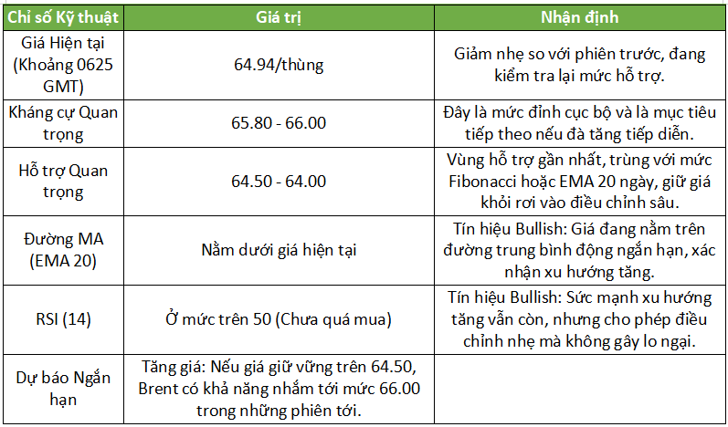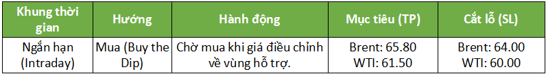 Kháng cự 66 (Brent): Đây là rào cản tâm lý mạnh. Nếu vượt qua, giá có thể mở rộng đà tăng về vùng 67.50.