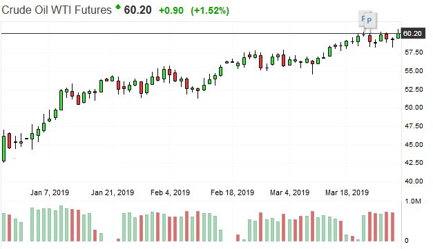 giá dầu WTI chuẩn của Mỹ giao tháng 5 tăng 0,84 USD, tương đương 1,4% trên Sở giao dịch hàng hóa New York, lên 60,14 USD/ thùng, mức đóng cửa cao nhất kể từ ngày 09/11/2018 đến nay. Giá dầu thô đã duy trì mức tăng sau khi dữ liệu hàng tuần từ công ty dịch vụ mỏ dầu Baker Hughes công bố số lượng giàn khoan dầu của Hoa Kỳ đã giảm thêm 8 giàn trong tuần này. Kết thúc phiên hôm qua, giá dầu WTI đánh dấu mức tăng vọt 32,4% trong quý 1 đầu năm 2019, là mức tăng hàng quý mạnh nhất kể từ quý hai năm 2009.