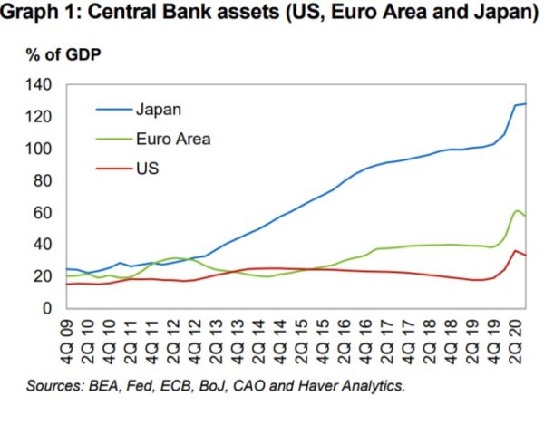 Trong số các ngân hàng trung ương của những nền kinh tế phát triển lớn, Cục Dự trữ Liên bang Mỹ đã đưa ra một biện pháp kích thích lớn, cắt giảm lãi suất 150 điểm cơ bản xuống khoảng 0 vào tháng Ba. Trong khi đó, Ngân hàng Trung ương Châu Âu (ECB) và Ngân hàng Trung ương Nhật Bản (BoJ), không thay đổi lãi suất chính sách của họ, vì chúng đã ở mức 0, hoặc thậm chí hơi âm. Tuy nhiên, tất cả họ đều tham gia vào việc mở rộng đáng kể bảng cân đối kế toán để hỗ trợ tiếp cận tín dụng (Biểu đồ 1). Các chính sách tiền tệ nới lỏng này đã giúp lấy lại sự bình tĩnh trên thị trường tín dụng chính phủ và doanh nghiệp, bao gồm thị trường tín dụng năng lượng, vốn đã rất khó khăn hồi tháng Ba.