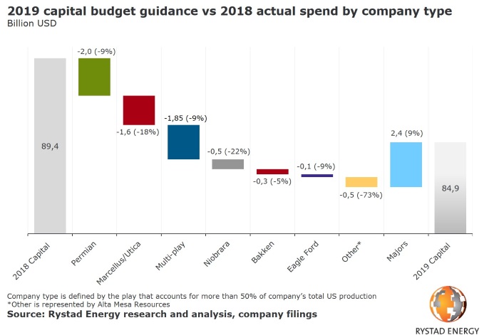 Rystad Energy đã phân tích các báo cáo thu nhập được phát hành gần đây trong quý 4 năm 2018 từ 45 nhà khai thác nội địa Mỹ, mà trong những báo cáo đó cũng bao gồm các chỉ báo của các nhà khai thác về chi tiêu cho sản xuất và vốn trong năm tới.