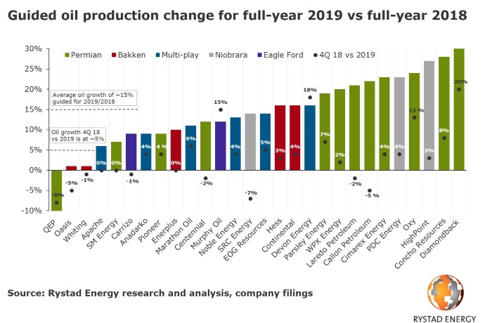 Các con số có vẻ khác nhau nếu sản xuất dầu theo kế hoạch năm 2019 được so sánh với tỷ lệ dầu được báo cáo trong quý 4 năm 2018. Trung bình, tỷ lệ sản xuất 2018 của các công ty tập trung khai thác khu vực đất liền Mỹ cao hơn đáng kể so với trung bình cả năm.