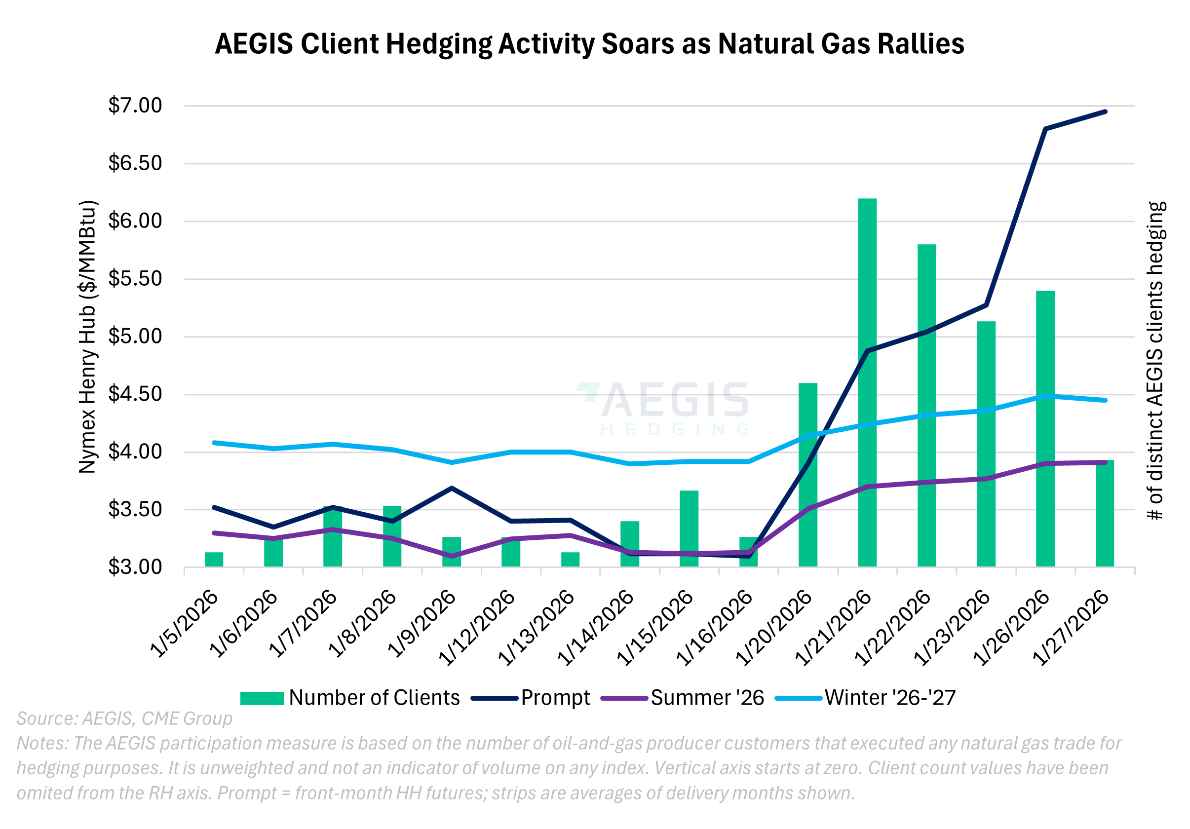 AEGIS quản lý một phần đáng kể hoạt động phòng ngừa rủi ro dầu khí của Mỹ với tư cách là công ty tư vấn phòng ngừa rủi ro độc lập lớn nhất nước, cung cấp cái nhìn riêng về cách các nhà sản xuất phản ứng với những thay đổi lớn trên đường cong giá kỳ hạn. Sự gia tăng gần đây cho thấy các nhà phòng ngừa rủi ro thương mại nhanh chóng chuyển sang giảm thiểu rủi ro khi sự biến động tạo ra các khung giá hấp dẫn.