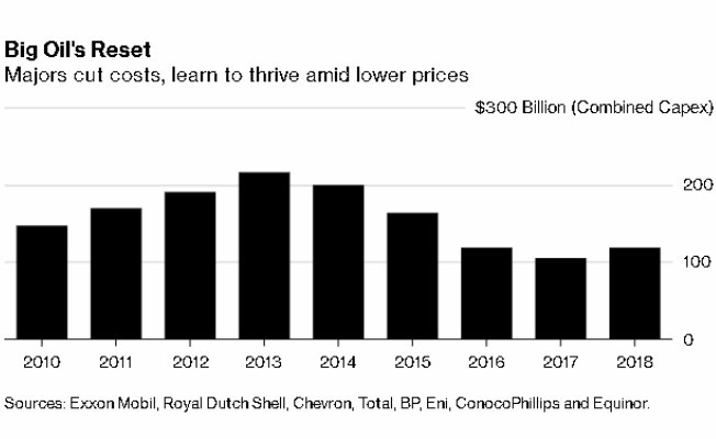Mức chi tiêu của tám tập đoàn dầu khí tích hợp lớn nhất thế giới (ExxonMobil, Shell, Chevron, Total, BP, Eni, ConocoPhillips và Equinor) đã giảm về mức 118 tỉ đô la vào năm ngoái, giảm 45% so với mức 215 tỉ đô la vào năm 2013. Ảnh: Bloomberg