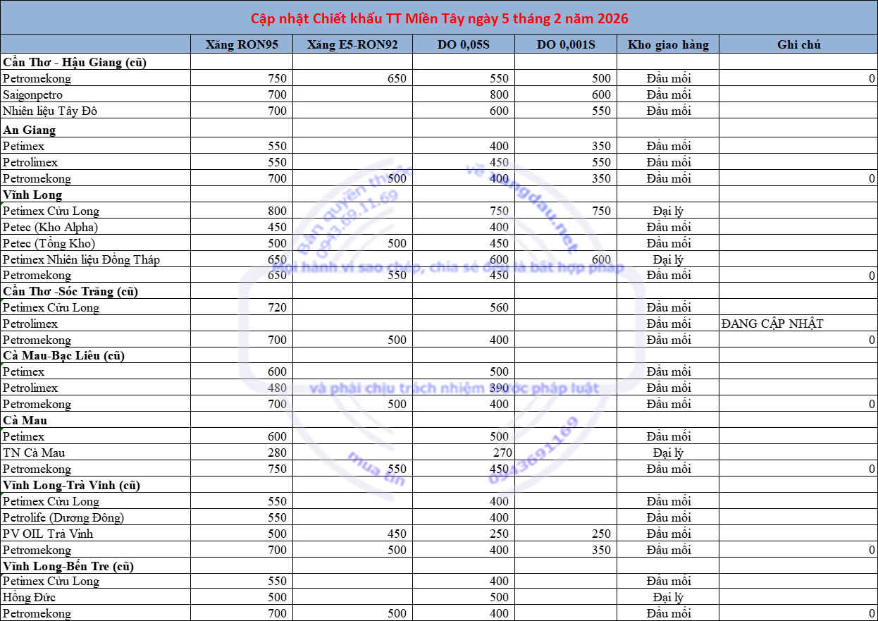 Cập nhật Chiết khấu TT Miền Tây ngày 5 tháng 2 năm 2026