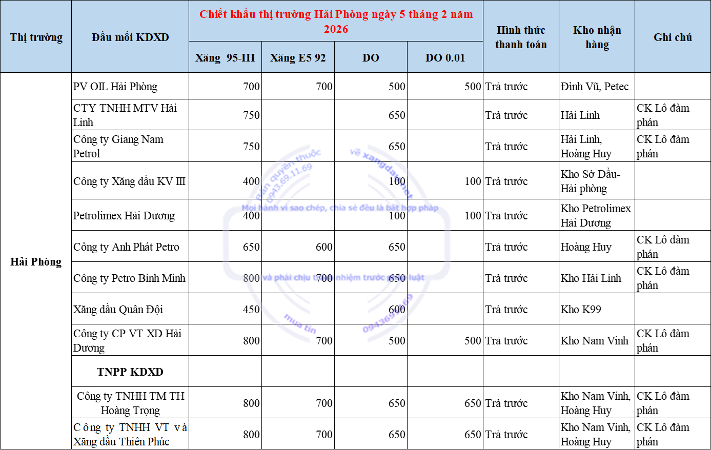 Chiết khấu thị trường Hải Phòng ngày 5 tháng 2 năm 2026