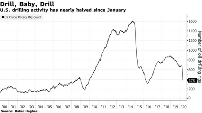 Chỉ số tốt nhất đo lường sự vận động của ngành công nghiệp dầu mỏ Mỹ là số lượng giàn khoan đang hoạt động. Tuần trước, chỉ số này đã giảm xuống mức thấp trong bốn năm. Trước khi đại dịch bùng nổ, các công ty dầu vận hành khoảng 650 giàn khoan tại Mỹ, nhưng tới thứ sáu tuần trước, hơn 40% trong số này đã ngừng hoạt động, chỉ còn lại 378 giàn khoan.
