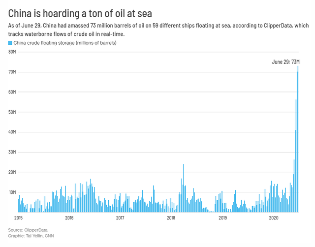 Số liệu của ClipperData cho thấy tính đến ngày 29/6/2020, thị trường tiêu thụ dầu mỏ lớn thứ 2 thế giới sau Mỹ là Trung Quốc đã mua đến 73 triệu thùng dầu và vận chuyển trên 59 tàu chở dầu lênh đênh ngoài biển. Số lượng này tương đương với ¾ tổng nhu cầu tiêu thụ dầu mỏ toàn thế giới. Điều kỳ lạ là Trung Quốc không sử dụng ngay hoặc lưu kho số dầu này mà để chúng lênh đênh trên các tàu chở dầu ngoài biển.