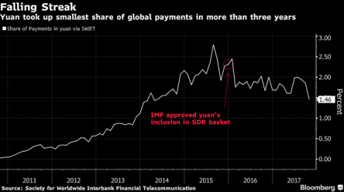 Tỉ lệ các giao dịch bằng đồng NDT trên thị trường quốc tế - Ảnh: Bloomberg