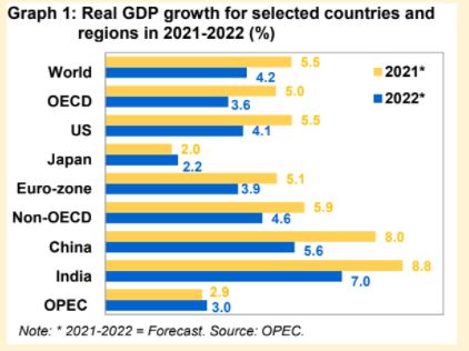 Vào năm 2022, nhu cầu dầu mỏ thế giới được dự báo sẽ tăng 4,2 triệu thùng/ngày so với năm 2021, nhờ việc ngăn ngừa COVID-19 cải thiện và tỷ lệ tiêm chủng tăng, cho phép hoạt động kinh tế và việc đi lại trở lại mức trước đại dịch, đặc biệt là hỗ trợ nhiên liệu giao thông. Nhu cầu dầu của OECD được dự báo sẽ tăng 1,8 triệu thùng/ngày vào năm 2022, trong khi khu vực ngoài OECD dự kiến tăng 2,3 triệu thùng/ngày, được hỗ trợ bởi động lực ổn định trong các hoạt động kinh tế, đặc biệt là Trung Quốc, Ấn Độ và các nước châu Á khác. Trong khi tỷ lệ tiêm chủng tăng lên, thì tác động của biến thể Omicron được dự báo là nhẹ và chỉ tồn tại trong thời gian ngắn.