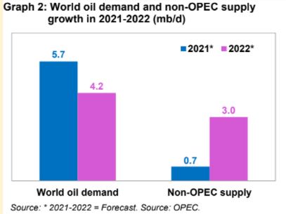 Vào năm 2022, nguồn cung ngoài OPEC được dự báo sẽ tăng trưởng mạnh mẽ 3 triệu thùng/ngày so với năm nay, nhờ vào sự gia tăng dần dần các hoạt động khoan và hoàn thiện ở Mỹ, dẫn đến mức tăng trưởng dự kiến là 0,6 triệu thùng/ngày. Sản lượng của Mỹ và Nga được dự báo sẽ đóng góp 2/3 tổng mức tăng trưởng dự kiến, tiếp theo là Brazil, Canada, Kazakhstan, Na Uy và Guyana. Tuy nhiên, đầu tư vào khu vực thượng nguồn ngoài OPEC trong năm 2021 và 2022 ước tính vào khoảng 350 tỷ USD mỗi năm, giảm 50% so với mức năm 2014 và do đó làm hạn chế tiềm năng tăng trưởng.