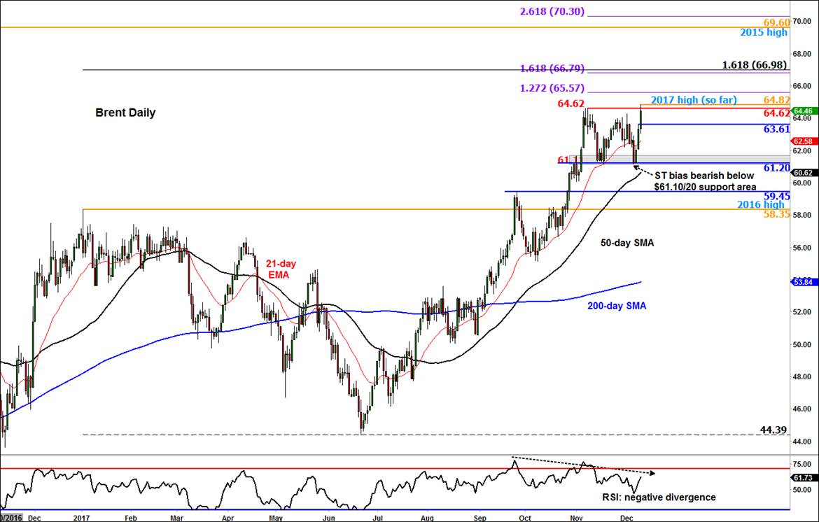 Song, dù Brent đang giao dịch ở mức cao nhất nhưng chắc chắn có rất nhiều lý do để giá có thể rớt xuống mức thấp hơn một lần nữa - trong số đó là dự báo rằng nguồn cung sẽ tăng trở lại khi giá hồi phục, đặc biệt là ở Mỹ. Tuy nhiên, xét theo khía cạnh kỹ thuật, không có dấu hiệu rõ ràng cho thấy giá giảm trở lại sắp xảy ra, ngoại trừ chỉ số RSI đang trong tình trạng phân kỳ âm với giá. Đây không phải là một tín hiệu xấu nhưng chỉ là một cảnh báo rằng đà tăng có thể sẽ suy yếu. Người bán muốn thấy mô hình đảo chiều rõ ràng xuất hiện ở đây như là một nỗ lực phá vỡ giả. Dù kết quả như thế nào, chúng ta sẽ chuyển sang xu hướng đi xuống trong ngắn hạn khi phá vỡ cơ cấu thị trường, đặc biệt là phá vỡ dưới mức thấp vừa qua- trong trường hợp của Brent, là ở khu vực 61,1 -61,2 USD.