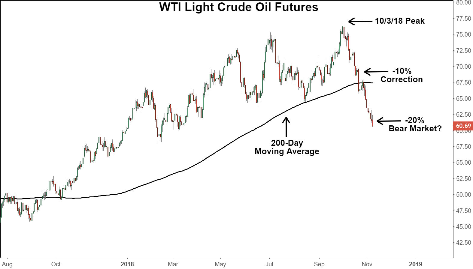 Trên biểu đồ dưới đây, sự sụt giảm giá dầu tương lai là rõ ràng. Từ mức cao gần bốn năm của đầu tháng 10 ở mức 76,90, dầu thô ban đầu rơi vào một mức điều chỉnh -10% và sau đó giảm xuống dưới mức trung bình động 200 ngày quan trọng vào cuối tháng 10. Từ đó, các khoản giảm tiếp tục để hơn -20% so với đỉnh đầu tháng 10, tính đến thứ Năm tuần này.