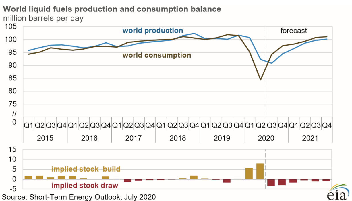 Nguồn cung thế giới 94,59 triệu bpd, nhu cầu tiêu thụ 92,89 triệu bpd, dư thừa ở mức 1,7 triệu bpd. Sang năm 2021 EIA dự báo thiếu hụt nguồn cung khoảng 1,12 triệu bpd, trong khi sản lượng khai thác dầu thô Mỹ tăng 210.000 bpd lên 11,01 triệu bpd. Năm 2020 Mỹ sẽ khai thác 11,63 triệu bpd (+30.000 bpd):