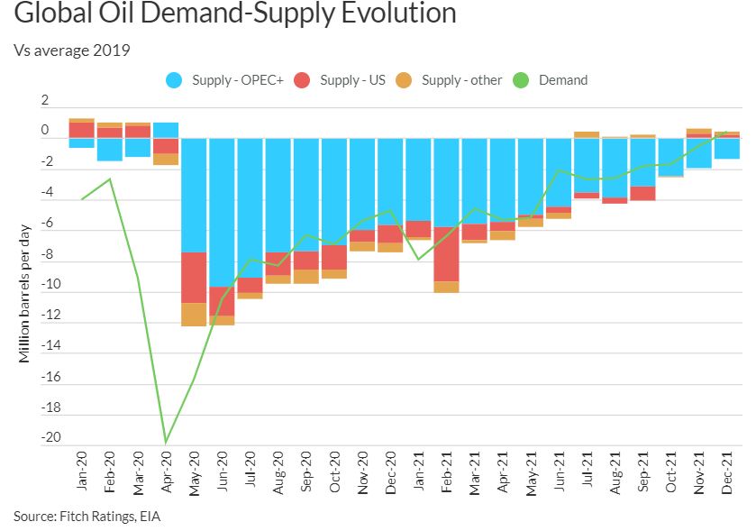 Nhu cầu dầu phục hồi do các hạn chế liên quan đến đại dịch được nới lỏng và các chính sách nguồn cung thận trọng của OPEC+ đã giúp giá dầu phục hồi về mức trước đại dịch, hãng xếp hạng tín nhiệm Fitch Ratings cho biết. Tuy nhiên, tình hình thị trường dầu vẫn còn nhiều bất ổn do sự xuất hiện của biến thể Omicron, có thể dẫn đến đợt phong tỏa mới và hạn chế đi lại, đồng thời có thể làm tăng tính biến động giá trong thời gian tới.