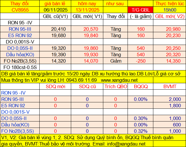 Thời điểm từ 15h00 ngày 06/11/2025 có hiệu lực đến kỳ điều chỉnh 15h00 ngày 13/11/2025. |