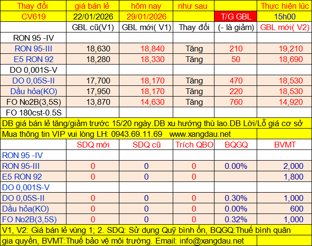 Thời điểm từ 15h00 ngày 22/01/2026 có hiệu lực đến kỳ điều chỉnh 15h00 ngày 29/01/2026. |