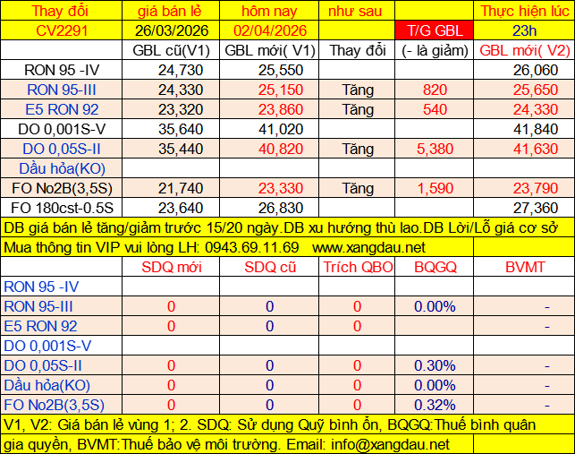 Thời điểm từ 24h00 ngày 26/03/2026 có hiệu lực đến kỳ điều chỉnh 23h00 ngày 02/04/2026. |