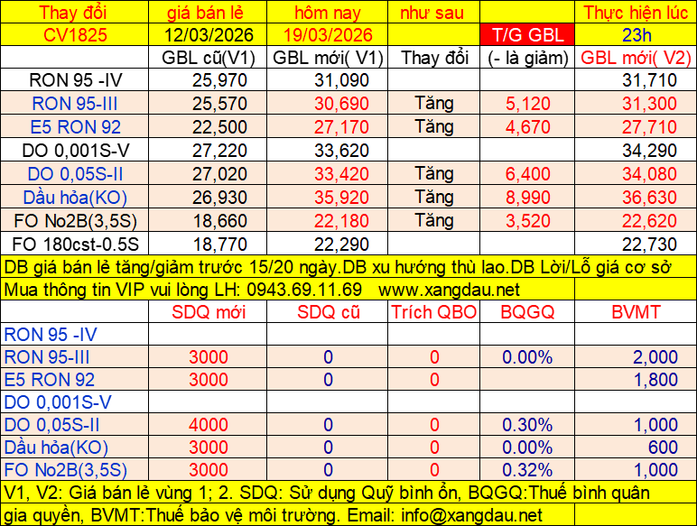 Thời điểm từ 22h00 ngày 12/03/2026 có hiệu lực đến kỳ điều chỉnh 23h00 ngày 19/03/2026. |