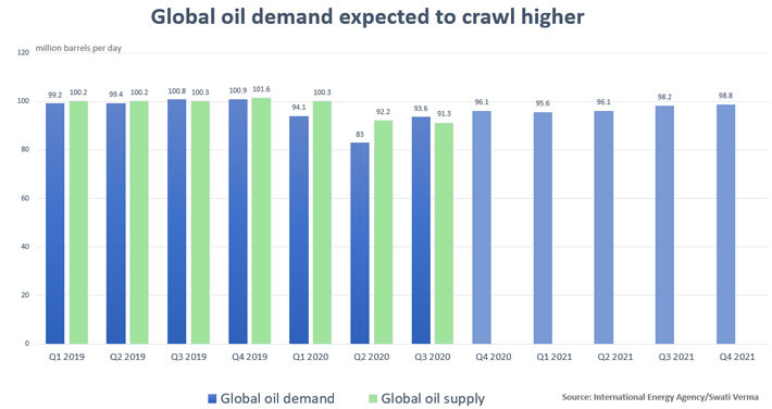 tương quan nguồn cung dầu (màu xanh dương) và nhu cầu tiêu thụ dầu (màu xanh lá) của thế giới. Đơn vị: triệu thùng/ngày - Nguồn: Cơ quan Năng lượng Quốc tế (IEA)/Reuters.