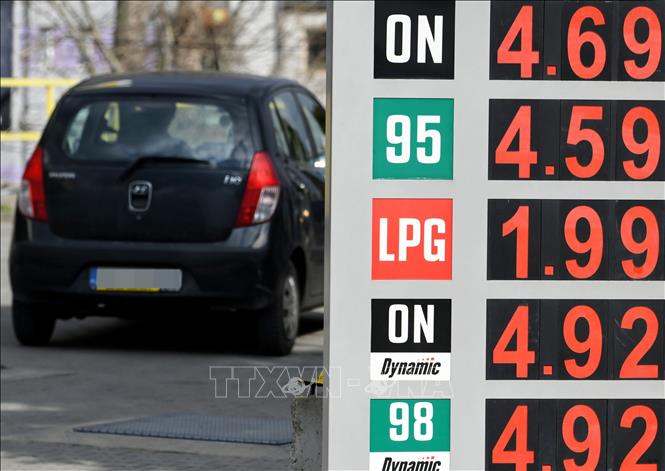 Giá xăng dầu được niêm yết tại trạm xăng ở Rzeszow, Ba Lan. Ảnh: PAP/TTXVN