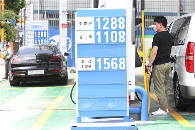 Giá xăng dầu được niêm yết tại trạm xăng ở Seoul, Hàn Quốc. Ảnh: Yonhap/TTXVN