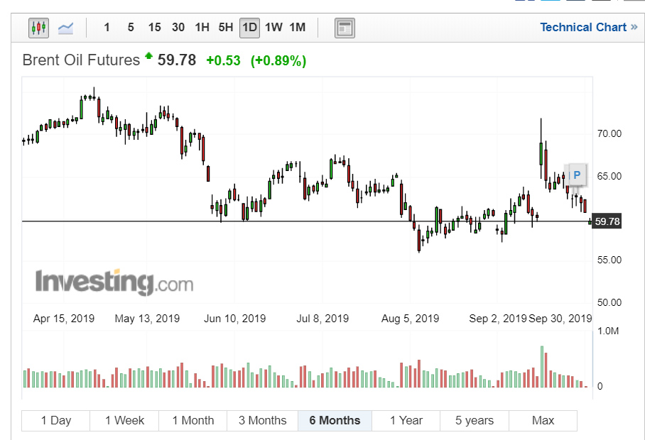 Tháng 9 chứng kiến sự biến động mạnh của giá dầu. Có lúc giá dầu Brent tăng gần 20% trong một phiên giao dịch, mức tăng mạnh chưa từng thấy trong lịch sử, sau khi một cơ sở dầu lửa trọng yếu của Saudi Arabia bị tấn công. Tuy nhiên, giá dầu đã giảm liên tiếp trở lại sau đó nhờ nỗ lực của Saudi Arabia nhanh chóng khôi phục phần sản lượng dầu bị mất. Nhờ đó, mức chốt tháng của giá dầu gần như không thay đổi so với xuất phát điểm vào đầu tháng.