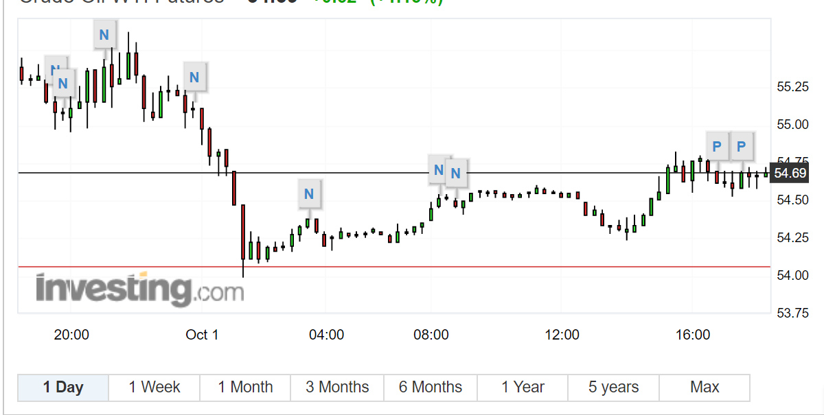 Kết thúc phiên giao dịch ngày hôm nay theo giờ Việt Nam, giá dầu thế giới ở mức Ghi nhận của Petrotimes, tính đến đầu giờ sáng 1/10, , trên sàn New York Mercantile Exchanghe, giá dầu thô ngọt nhẹ WTI giao tháng 12/2019 đứng ở mức 54,73 USD/thùng, tăng 0,66 USD/thùng trong phiên. Tuy nhiên, nếu so với cùng thời điểm ngày 30/9, giá dầu WTI giao tháng 12/2019 đã giảm tới 1,53 USD/thùng.
