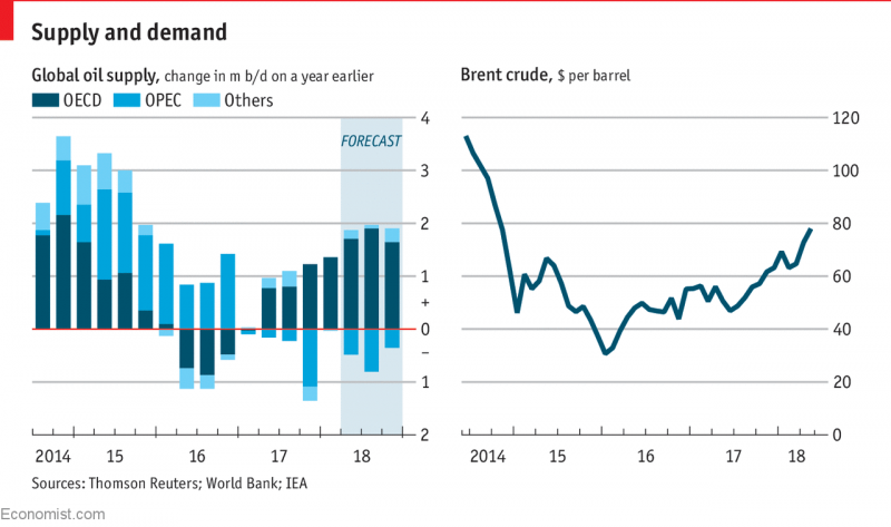 Và trong khi thế giới bắt đầu cần nhiều dầu hơn, thì nguồn cung dầu đã ít hơn. Vào đầu năm 2017 OPEC, một câu lạc bộ các nước xuất khẩu dầu mỏ, cũng như các quốc gia không thuộc OPEC do Nga dẫn đầu, đã thực hiện cam kết cắt giảm sản xuất mà gần như đã xóa bỏ hoàn toàn lượng dầu mỏ dư thừa toàn cầu. Nhóm OPEC + này ban đầu dự định cắt giảm chỉ trong một thời gian ngắn, nhưng đã kéo dài thỏa thuận hồi tháng 11 năm ngoái khi giá đang tăng lên. Các thành viên đôi khi bất kham của OPEC thậm chí còn tuân thủ quá mức các khoản cắt giảm đã hứa của họ: tính đến tháng trước, họ đã cắt giảm sản lượng của họ nhiều hơn 63% so với những gì họ đã hứa, theo Ngân hàng Thế giới. Sự suy giảm lớn nhất đến từ Venezuela, nơi mà nhiều năm quản lý kém hiệu quả của công ty dầu mỏ nhà nước đã khiến sản lượng giảm hơn nửa triệu thùng mỗi ngày trong năm qua.