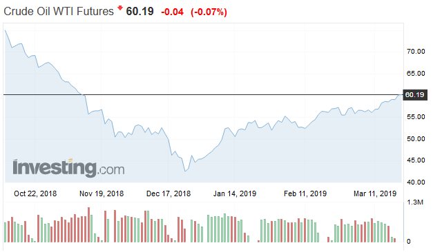 Giá dầu WTI chuẩn của Mỹ kỳ hạn tháng 4 tăng 0,8 USD, tương đương 1,4%, kết thúc ở mức 59,83 USD/ thùng trên Sàn giao dịch hàng hóa New York (Nymex), sau khi chạm mức cao nhất trong ngày ở 60,12 USD/ thùng. Mức giá cao nhất trong ngày và mức gia thanh toán của hợp đồng này, vốn cũng đã hết hạn vào hôm qua, là mức cao nhất tính từ tháng 11/2018 đến nay. Trong khi đó, hợp đồng dầu WTI kỳ hạn tháng 5 tăng 0,94 USD, tương đương 1,6%, đóng cửa ở 60,23 USD.
