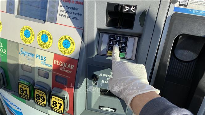Đổ xăng cho phương tiện tại một trạm xăng ở Los Angeles, bang California, Mỹ ngày 18/3/2020. Ảnh: AFP/TTXVN