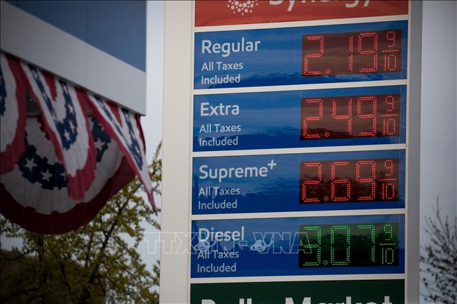 Giá xăng dầu được niêm yết tại trạm xăng ở New York, Mỹ ngày 20/4/2020. Ảnh: THX/TTXVN
