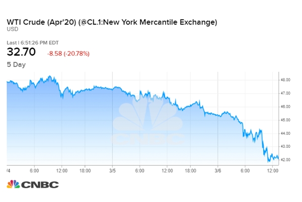 Giá dầu Brent tương lai sụt 30% xuống 31,02 USD/thùng, thấp nhất kể từ tháng 2/2016. Giá dầu WTI lao dốc 27% xuống 30 USD/thùng, cũng là mức thấp nhất kể từ tháng 2/2016. Giá dầu WTI đang sắp ghi nhận phiên giao ịch tệ nhất kể từ tháng 1/1991 trong suốt thời gian chiến tranh vùng Vịnh.