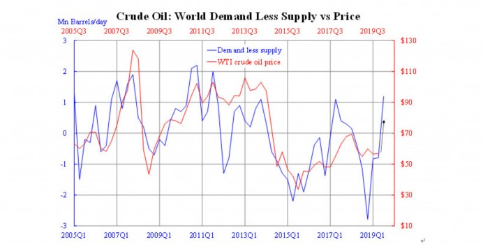 Trong biểu đồ kèm theo, chúng ta thấy tăng trưởng nhu cầu đối với dầu thô (tính bằng triệu thùng mỗi ngày) di chuyển song song với giá dầu. Trong thực tế, nhu cầu là một công cụ dự đoán cho giá cả với khoảng cách thời gian khoảng hai quý (so sánh các trục thời gian ngang màu xanh và đỏ). Khi tăng trưởng nhu cầu dầu thô tăng lên trong các quý trước, giá dầu dự kiến ít nhất sẽ tăng trong quý này.