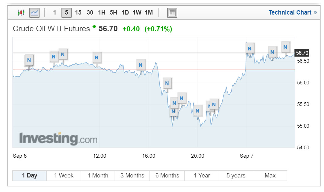 Đầu phiên giao dịch ngày 8/9 (theo giờ Việt Nam), giá dầu tiếp tục tăng. Dầu WTI tăng 0,7% lên 56,8 USD/thùng, giá dầu Brent giao kỳ hạn tháng 11/2019 tăng hơn 1% lên 61,62 USD/thùng.