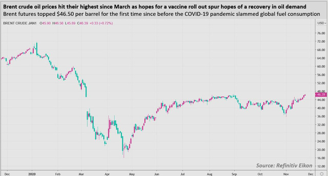 Giá dầu thô trên thị trường quốc tế tăng vọt lên mức cao chưa từng có kể từ tháng 3/2020 – thời điểm mới bùng phát mạnh dịch Covid-19 ở phương Tây, sau khi có thêm một vắc-xin nữa chống Covid-19 được công bố, làm dấy lên hy vọng kinh tế thế giới sẽ hồi phục nhanh vào năm tới, kéo nhu cầu dầu lên theo.