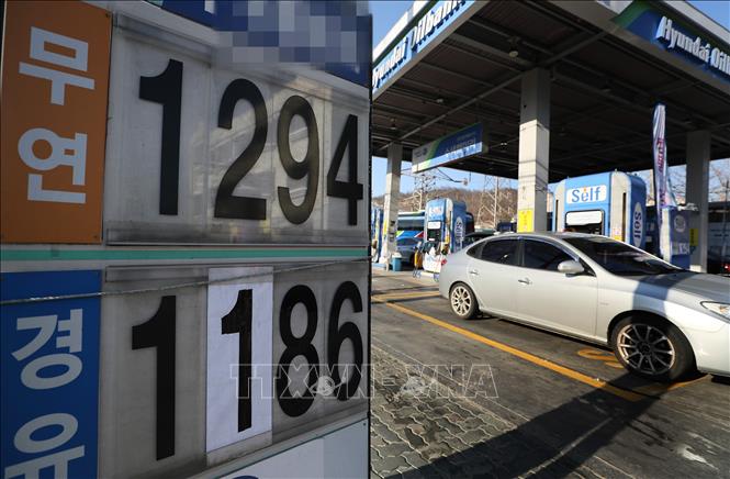 Bảng giá xăng dầu tại trạm xăng ở Seoul, Hàn Quốc. Ảnh: Yonhap/TTXVN