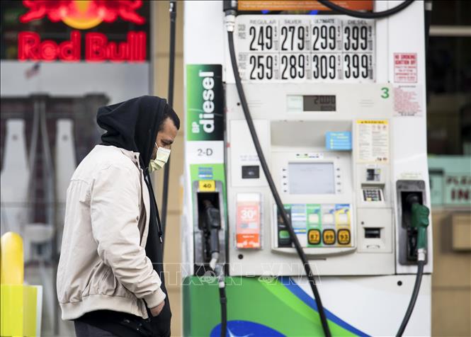 Giá xăng dầu được niêm yết tại một trạm xăng ở New York, Mỹ ngày 21/4/2020. Ảnh: THX/TTXVN