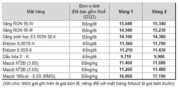 Trong khi đó, dầu diesel 0.05S: không cao hơn 11.218 đồng/lít, tăng 90 đồng/lít so với giá hiện hành; dầu hỏa: không cao hơn 9.717 đồng/lít, tăng 123 đồng/lít so với giá hiện hành; Dầu mazut 180CST 3.5S: không cao hơn 11.261 đồng/kg, tăng 340 đồng/kg so với giá hiện hành.