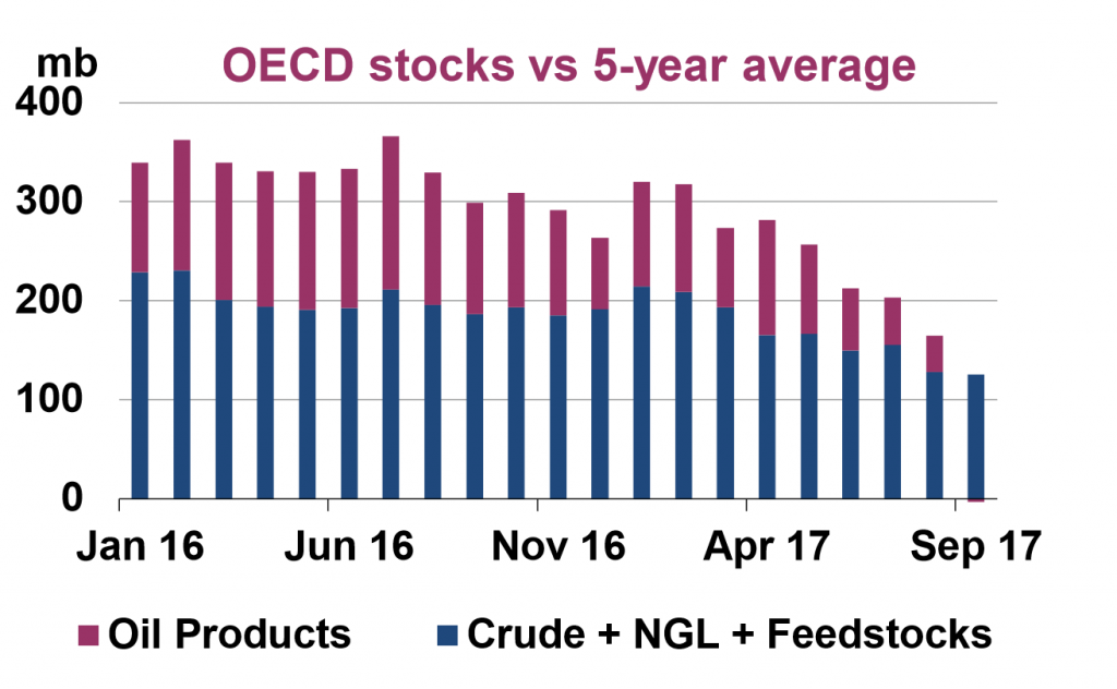 Bởi vì OPEC và các đối tác ngoài OPEC dự định tiếp tục giảm nguồn cung 1,8 triệu thùng/ngày (khoảng 2% sản lượng toàn cầu) đến cuối năm 2018, thị trường có thể nhìn thấy thâm hụt cung/cầu trong năm tới. Điều đó sẽ làm giảm lượng hàng tồn kho xuống mức trung bình năm năm, và nó cũng làm tăng nguy cơ giá cả tăng vọt nếu có sự gián đoạn khác về cung. Goldman Sachs nói rằng mặc dù có sự không chắc chắn trong dự báo giá dầu, các nhà phân tích của họ tin rằng rủi ro là "nghiêng về hướng giá tăng lên trong năm 2018 do nguồn cung quá thắt chặt, hoặc là do sự gián đoạn mới, nhu cầu vượt quá dự báo lạc quan của chúng tôi hoặc OEPC để cho tồn kho giảm ngoài tầm kiểm soát."