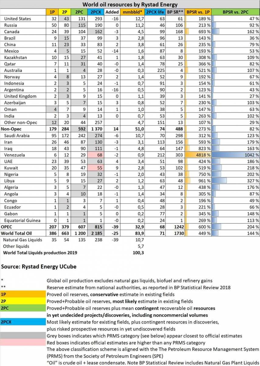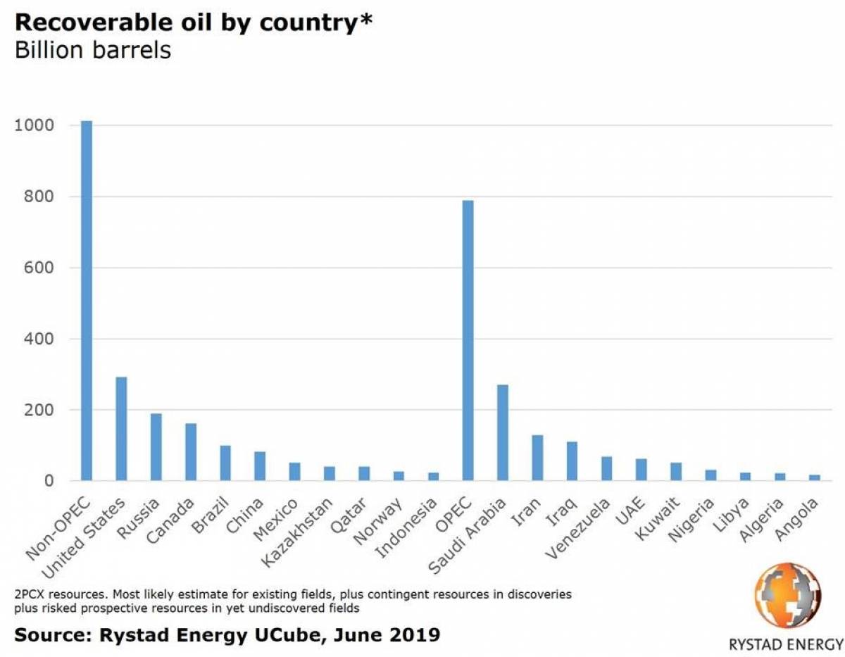 Trong báo cáo thường niên mới nhất về tài nguyên dầu có thể khai thác trên thế giới, Rystad Energy nhận thấy rằng Hoa Kỳ hiện đang nắm giữ 293 tỷ thùng trữ lượng dầu có thể khai thác. Con số này nhiều hơn 20 tỷ thùng so với của Saudi và cao hơn gần 100 tỷ thùng so với Nga. Ước tính dầu có thể khai thác của Mỹ bởi Rystad Energy cũng cao gấp năm lần so với trữ lượng xác minh đã được báo cáo chính thức khi được công bố trong Báo cáo thống kê về năng lượng thế giới 2019 của BP.