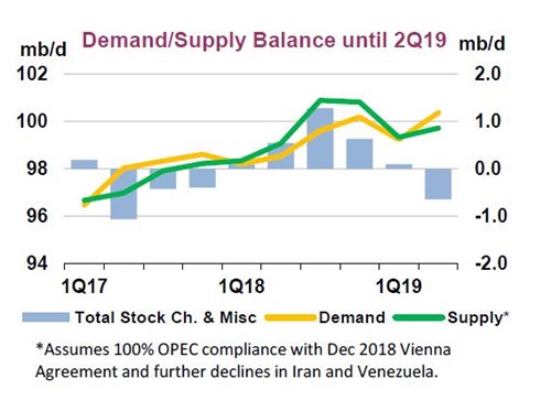 Trong báo cáo hồi tháng 11/2018, IEA cho biết họ dự kiến thị trường dầu toàn cầu vẫn dư thừa đến hết năm 2019. Hiện nay, họ dự kiến thiếu hụt sẽ thành hiện thực trong quý 2 năm tới với điều kiện OPEC tuân thủ thỏa thuận nguồn cung của mình.