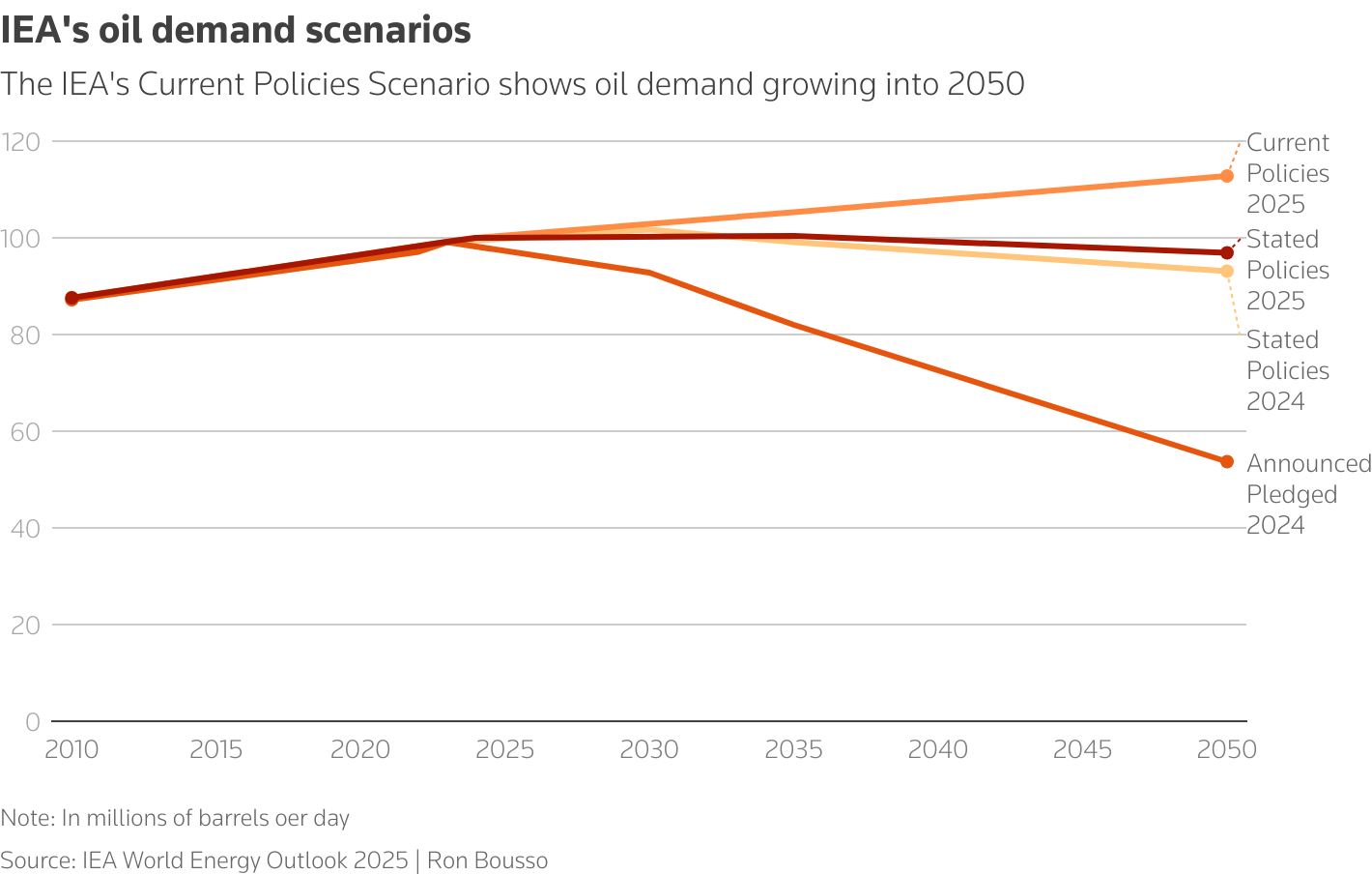 Trong Triển vọng Năng lượng Thế giới công bố hôm Thứ Tư, IEA dự đoán theo kịch bản chính sách hiện hành rằng nhu cầu dầu sẽ đạt 113 triệu thùng/ngày vào giữa thế kỷ, tăng khoảng 13% so với mức tiêu thụ năm 2024.