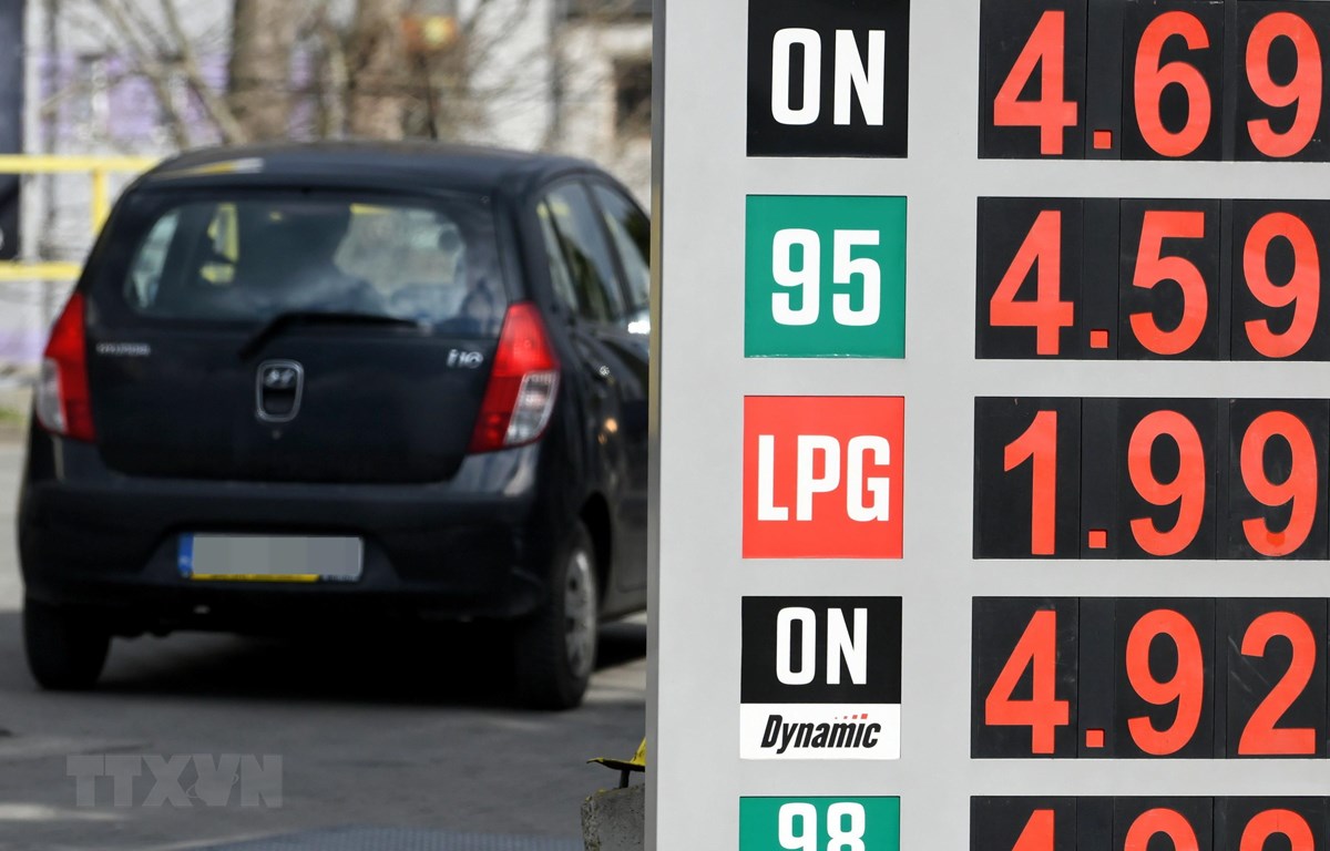 Giá xăng dầu được niêm yết tại trạm xăng ở Rzeszow, Ba Lan, ngày 23/3. (Ảnh: PAP/ TTXVN)