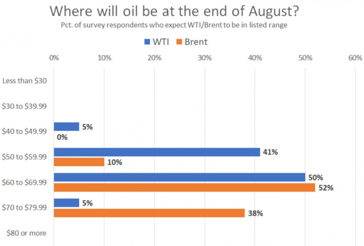 Theo Khảo sát Dầu của CNBC được thực hiện từ ngày 21 đến 26 tháng 6, năm mươi phần trăm các chuyên gia được thăm dò dự báo WTI sẽ nằm trong khoảng từ 60 đến 69,99 đô la vào cuối tháng 8, một phạm vi cao hơn mức 59 đô la của giá WTI hiện tại. 41% dự báo WTI trong phạm vi 50-60 USD - phạm vi mà chuẩn dầu của Mỹ đã giao dịch kể từ tháng 1 năm nay.