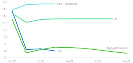StanChart nói rằng việc tái cân bằng thị trường dầu mỏ sẽ đòi hỏi nguồn cung bổ sung khoảng 2 triệu thùng/ngày trong thời gian còn lại của năm 2022, chủ yếu là do mức tồn kho hiện tại rất thấp và thêm 2 triệu thùng/ngày trong quý 2 để giảm bớt sự chênh lệch do sự chuyển dịch dầu của Nga. Mô hình của StanChart giả định rằng thỏa thuận OPEC+ hiện tại vẫn tiếp tục, xuất khẩu của Iran không tăng và tăng trưởng sản lượng của Hoa Kỳ so với cùng kỳ năm trước chỉ hơn 1,5 triệu thùng/ngày.