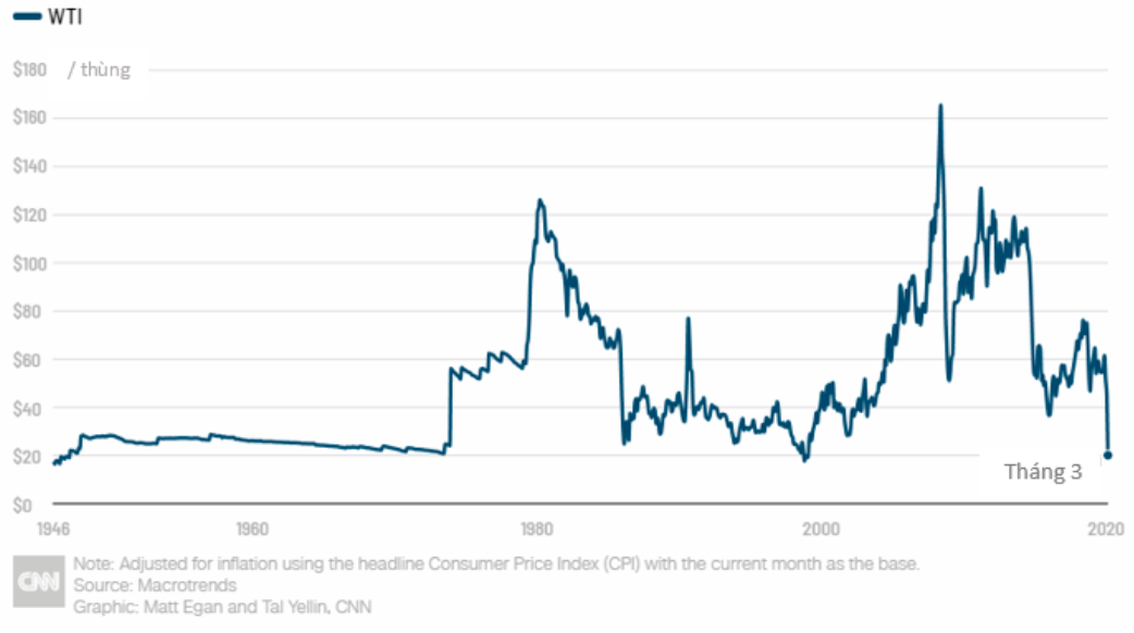 Trong 75 năm qua, giá dầu thô ngọt nhẹ WTI của Mỹ sau điều chỉnh lạm phát rất hiếm khi rẻ hơn so với hiện nay. Đơn vị: USD/thùng.