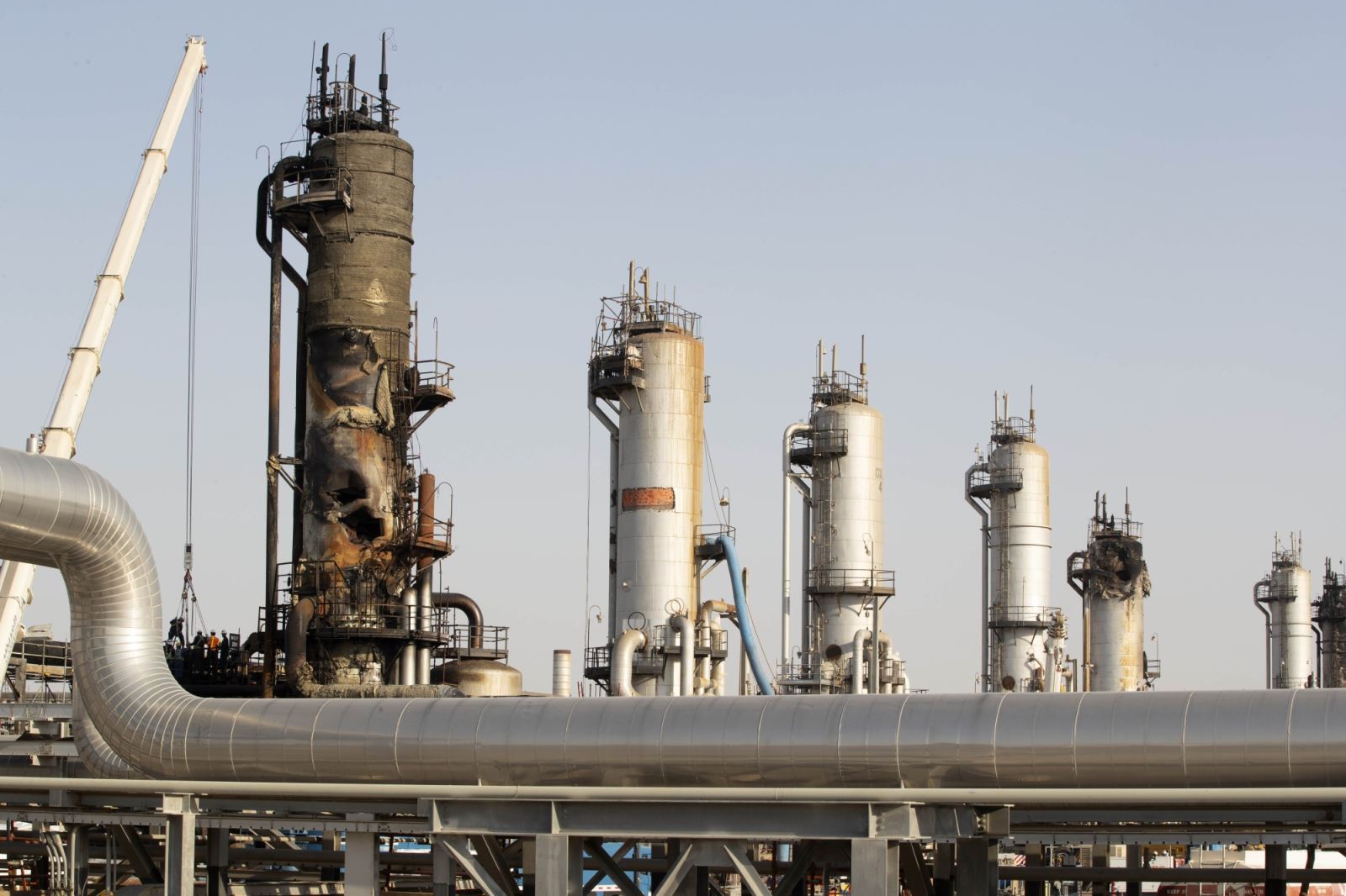 Tháp lọc dầu của Saudi Aramco tại cơ sở Abqaiq bị hư hại sau tấn công. Ảnh: Bloomberg