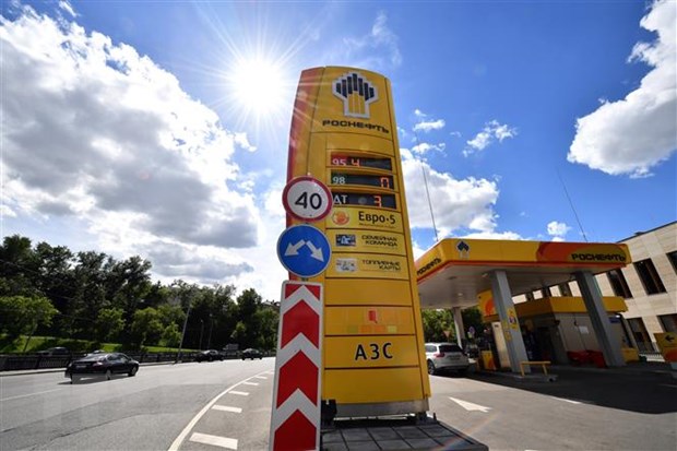 Biểu tượng tập đoàn dầu mỏ Rosneft tại trạm xăng ở Moskva, Nga. (Ảnh: AFP/TTXVN)